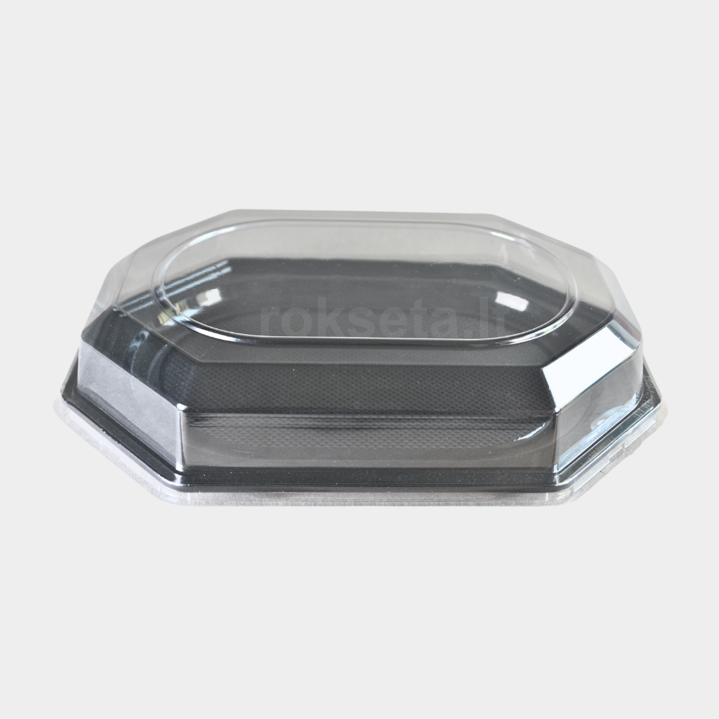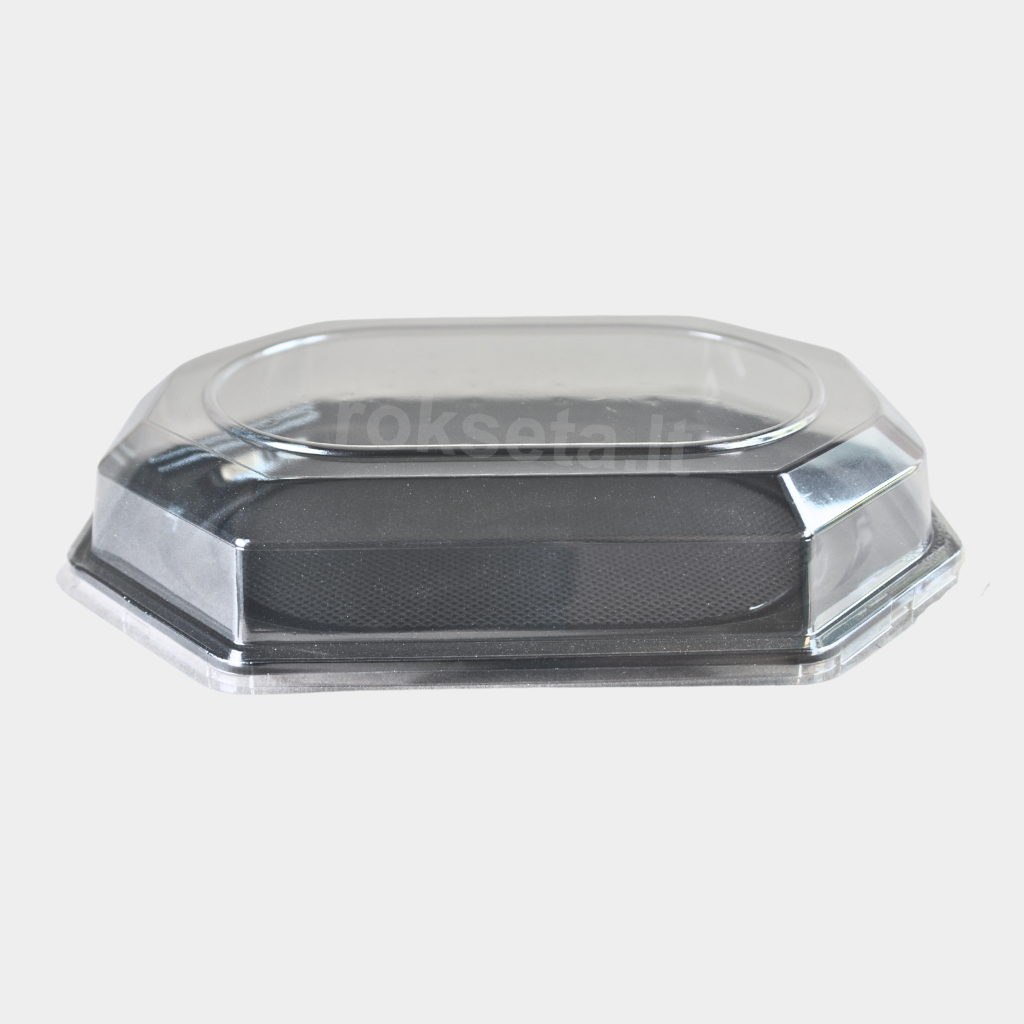 Black trays with transparent lids 430 x 280 mm.
